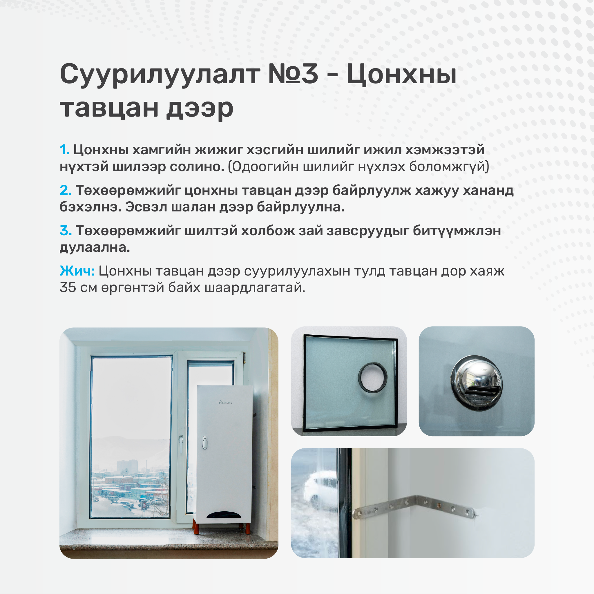 Airburg SE300 агаар сэлгэгч нь гаднах агаарыг 4 түвшний шүүлтүүрээр шүүн, шаардлагатай үед халаан оруулж цонх нээх шаардлагагүйгээр гэрийг тань хүчилтөрөгчөөр дүүрэн байлгана.